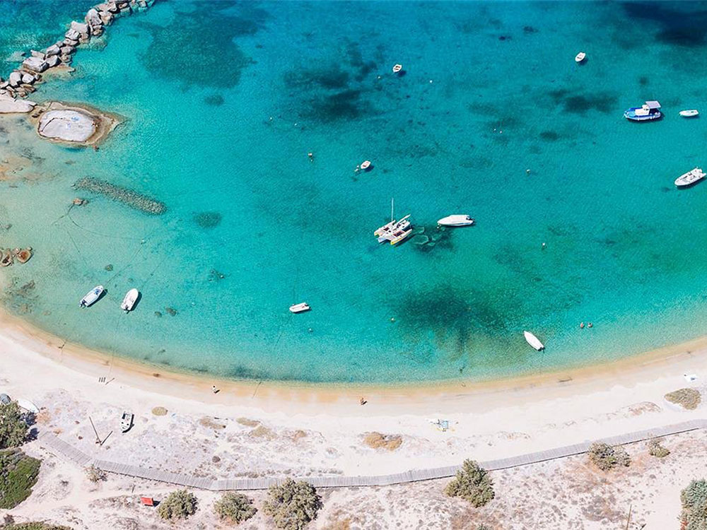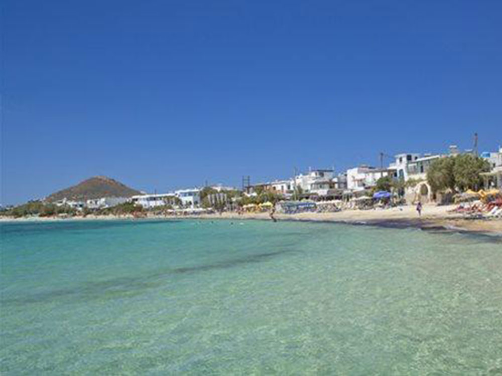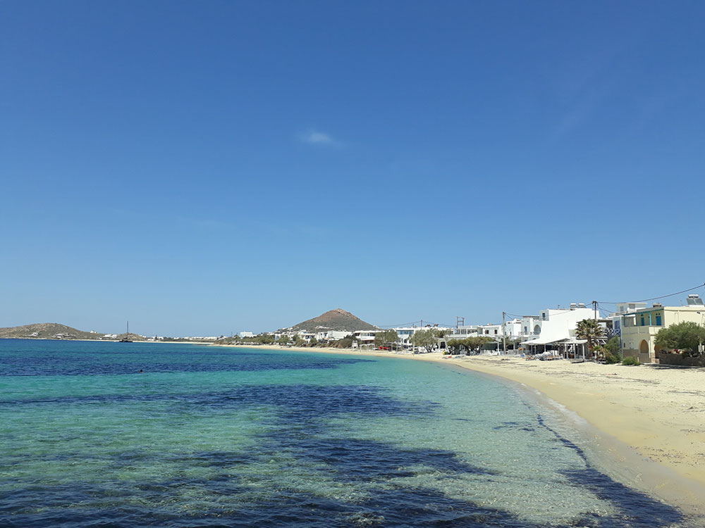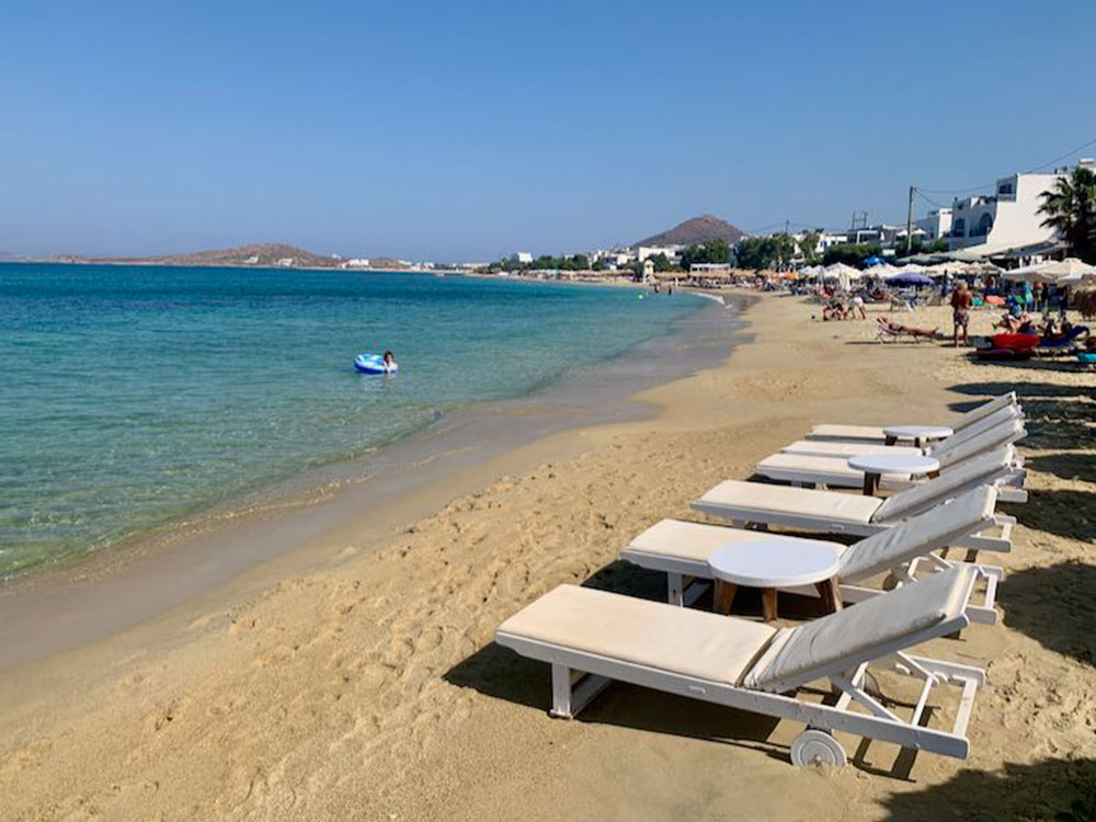 Organised with beds and umbrellas to rent, the beach is sandy and protected from the worst of the winds. There are water sport operators and a lifeguard, while nudists collect at the far eastern end which is quieter. Easily reached from Naxos Town, the bus drops right off at the beach and there is parking within the village.