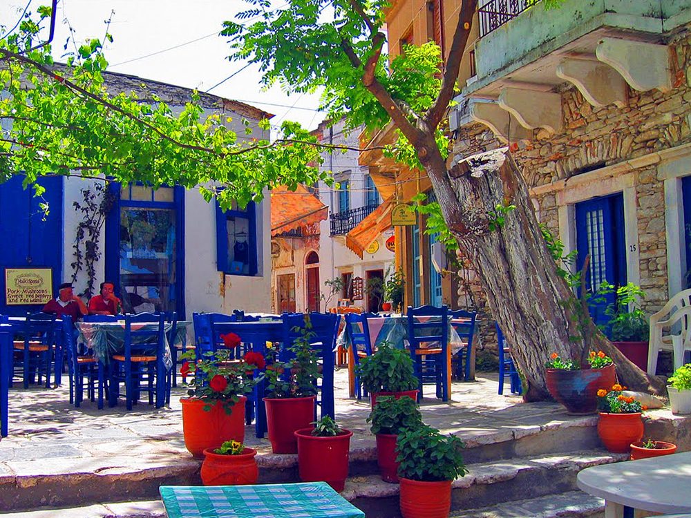 You’ll find shops, cafes, restaurants, galleries, and the historic Vallindra distillery, where you can sample the renowned Naxiot citron, distilled from citron leaves. In the village square, you can take a break for coffee, desserts, and snacks.