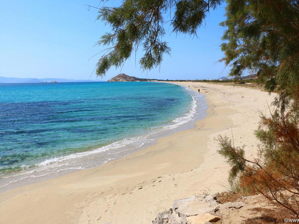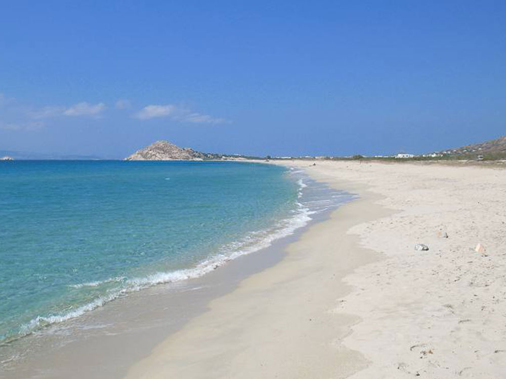 Even in high season the beach is never crowded and the fine sands are a glorious backdrop to the views over the blue-green Aegean towards Paros.